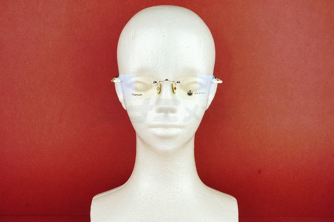 エッジを効かせた多角形のリムレスデザインが印象的なフレーム。