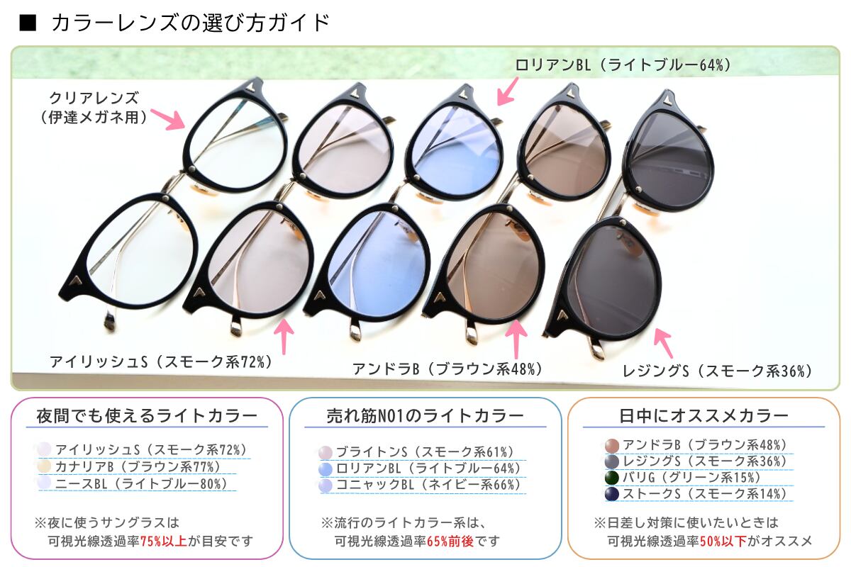 カラーレンズを希望の際は、お写真のカラーレンズ一覧からご希望のカラーをお選びください。