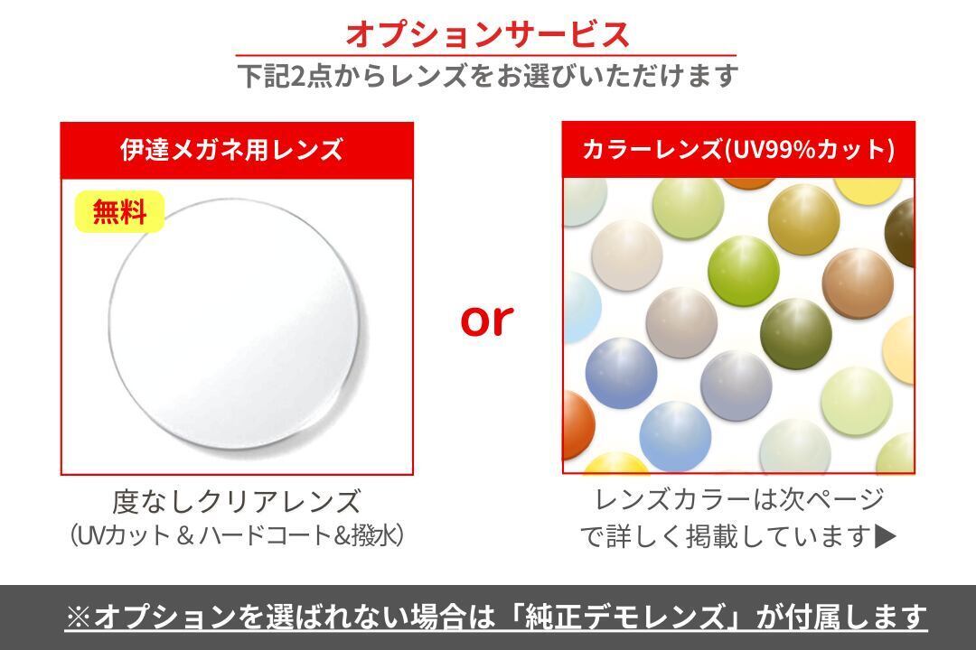※レンズ交換をしないまま使う(伊達メガネ)場合は「クリアレンズ」への交換をオススメしております。