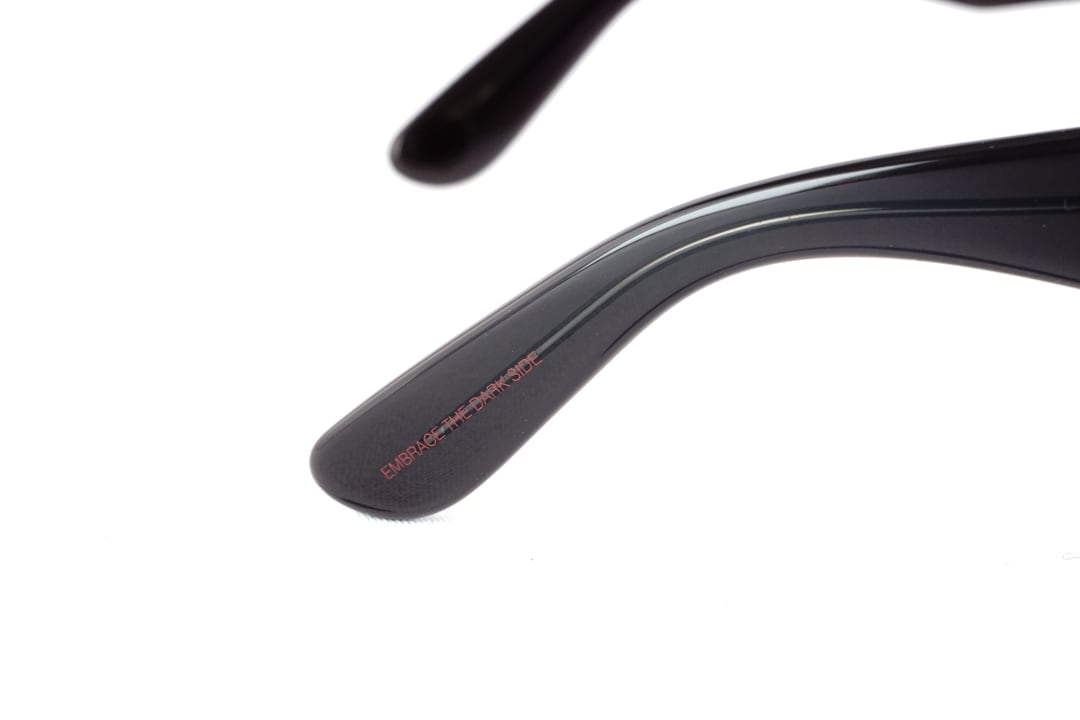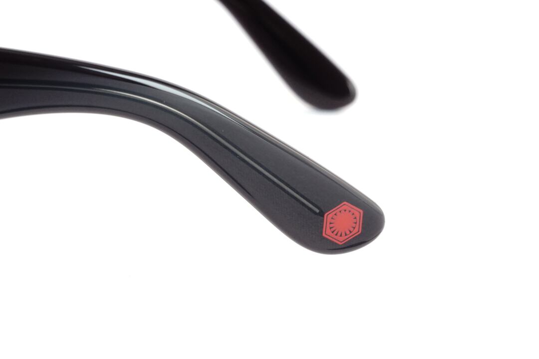 透明感のあるブラックフレームに、偏光シルバー×レッドのミラーレンズを組み合わせ、ダークサイドの力強さと近未来的なムードを表現。テンプルには暗黒面を受け入れよのフレーズとファースト・オーダーの紋章を刻印し、細部まで物語性を宿しています。