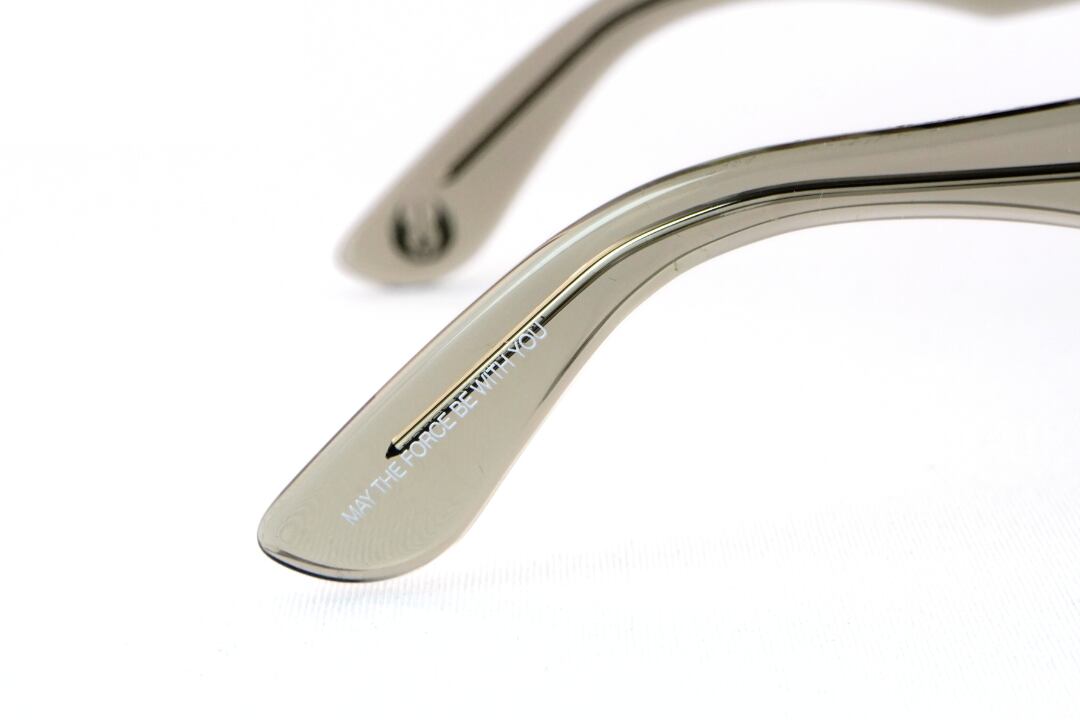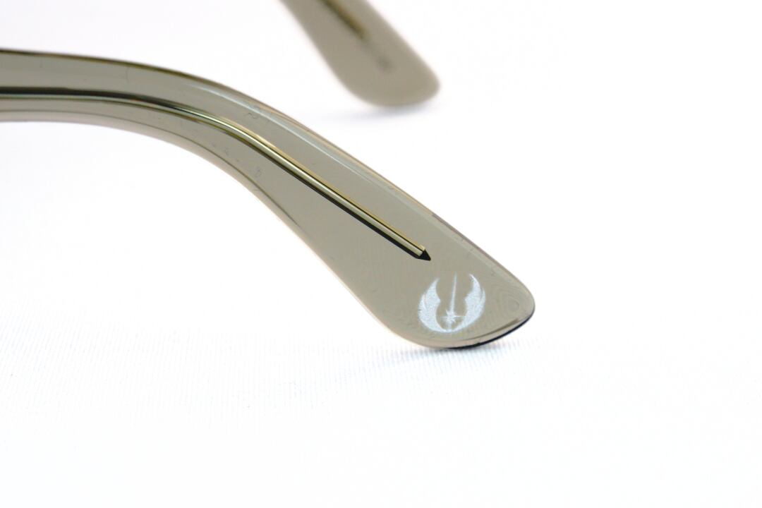 透明感のあるセージグリーンのフレームに、同系色のグリーンレンズを組み合わせ、静けさと叡智を感じさせる落ち着いたカラーリングを実現。テンプルにはジェダイ・オーダーの紋章とフォースと共にあれのフレーズを刻印し、細部まで世界観を表現しています。