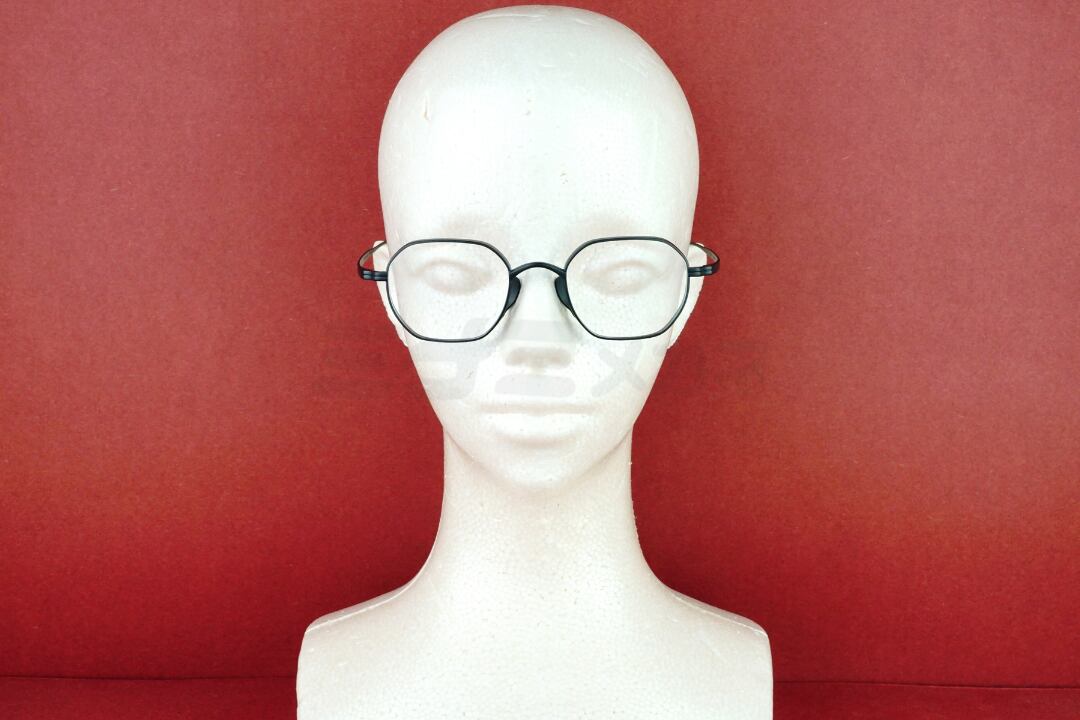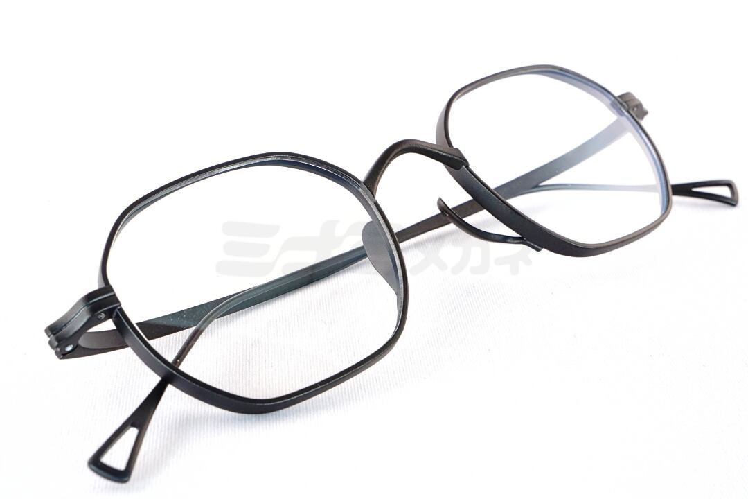 やや角を持たせた多角形寄りのシェイプが特徴のメタルフレーム。