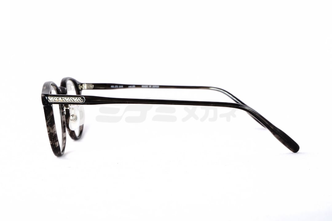 シンプルでキレイ目なデザインでありながら、ワンポイントでテンプルに伝統工芸などで用いられる網代紋様(アジロモンヨウ)の金属モチーフがあしらわれています。