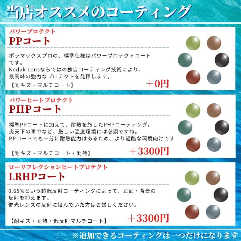 ■ PPコート:標準コートですが、傷防止・耐熱など一般的なレンズより高い水準で仕上げています。とくに理由がなければ標準コートで問題ありません。