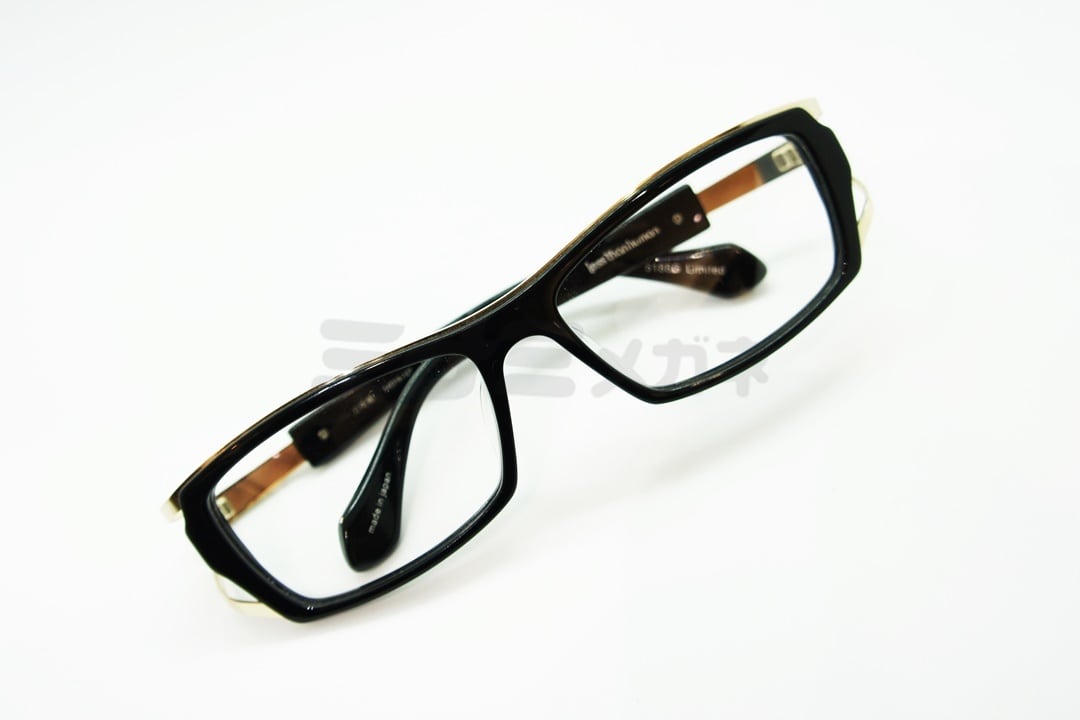 スクエアタイプのプラスチックフレームかと思いきや、フロント上部に金属をあしらっているメガネ。