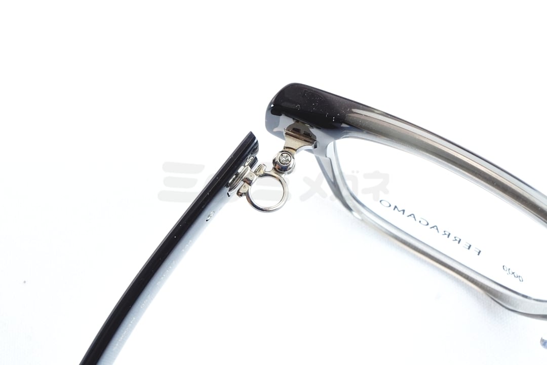 今回のコラボフレーム最大の特徴は、999.9の「バネ式ヒンジ」にフェラガモのブランドアイコン「ガンチーニ」デザインをあわせた「ガンチーニヒンジ」。