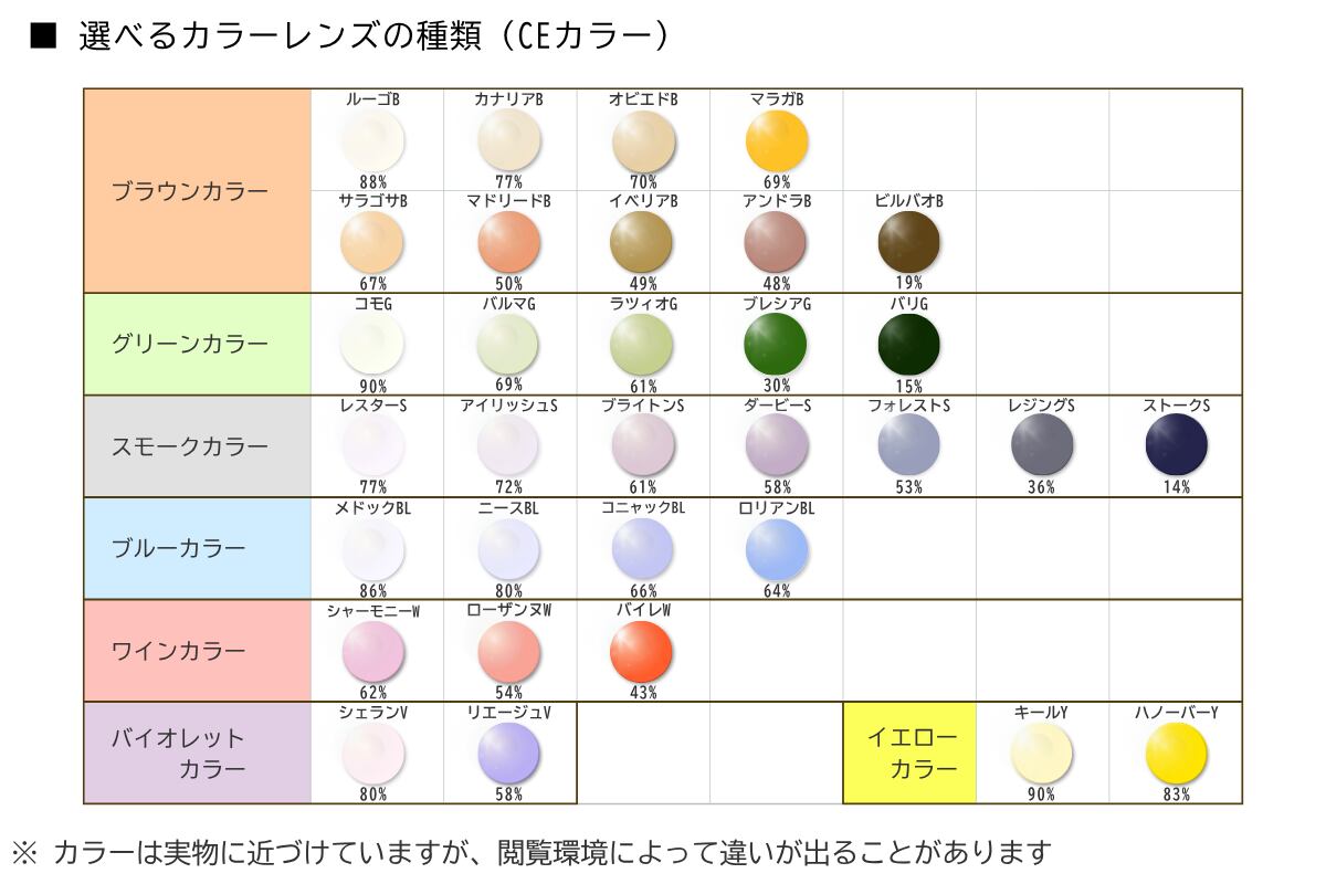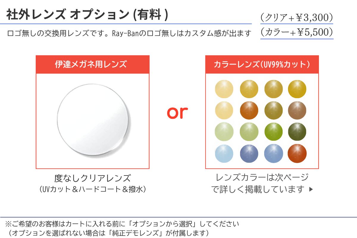 UVカットレンズやカラーレンズ等をご希望の方は、有料オプションから選択、もしくはレンズカテゴリーから交換用レンズを選んで同時に購入してください。