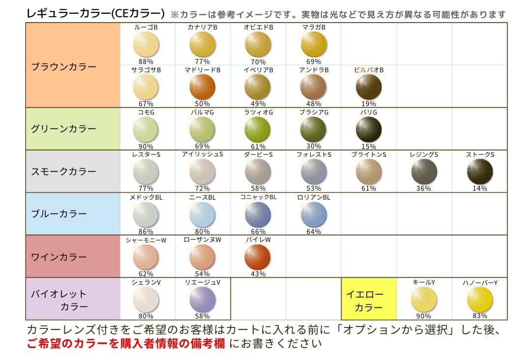 カラーレンズを希望の際は、お写真のカラーレンズ一覧からご希望のカラーをお選びください。